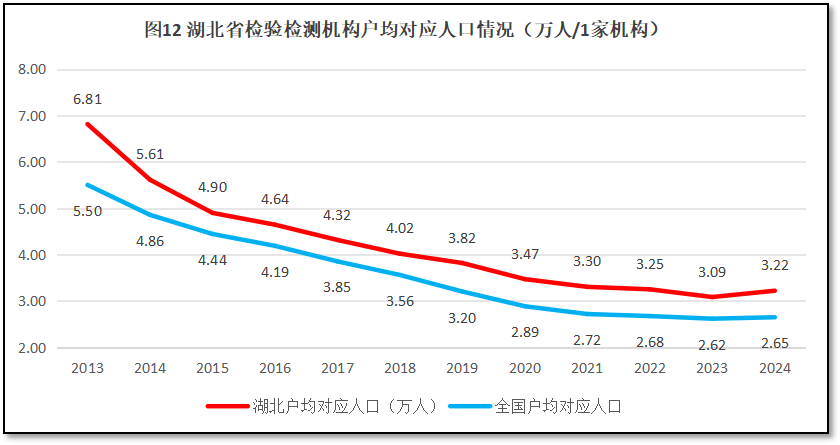 再来看湖北地区检验检测机构户均对应服务的人口情况。2024年末,湖北省常住人口5834万人,检验检测机构户均服务人口3.22万人,比全国平均数2.65万人高出5700人,排名全国第6位,较2023年度排名提升1位。可见,相对于湖北省人口数量来说,当地的检验检测机构数量显得并不多。过去12年,湖北省检验检测机构户均对应的人口数量与全国的情况进行比较,如图12所示。