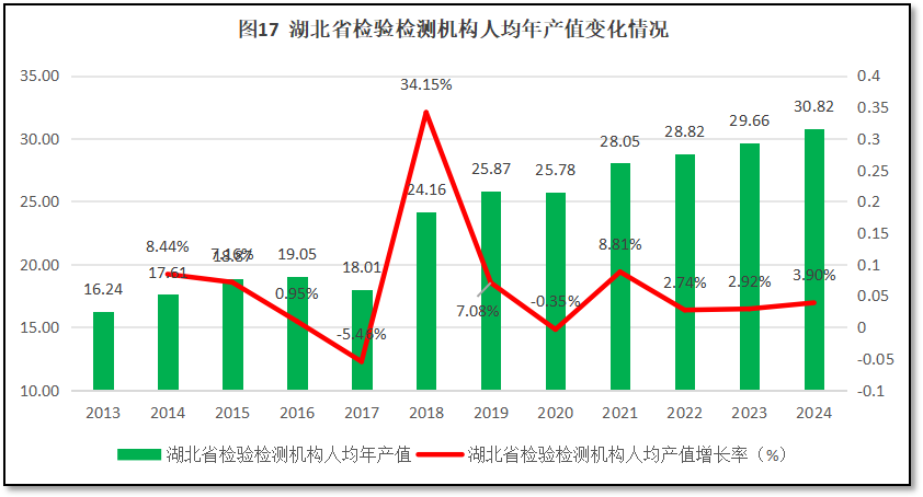 由图17可见,12年来,湖北省检验检测机构人均年产值总体保持增长,仅在2017和2020年出现过同比下降的情况,其余年份均保持正增长。2024年湖北省检验检测机构的人均年产值为30.82万元,是2013年的1.89倍。从增长率来看,湖北省人均年产值同比增幅曲线在2017年出现了一个同比增幅34.15%的高峰,其余年份起伏不太大,2024年度的同比增幅为3.9%。