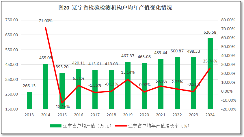 由图18可见,辽宁省检验检测机构人均年产值增长曲线在2023年之前都比较平坦,没有出现太大的增长峰值,增长动能不足,且与全国的增长率曲线的距离越拉越大,但2024年度出现了一个较为显著的增长,与全国的差距有所缩小。